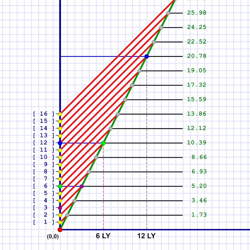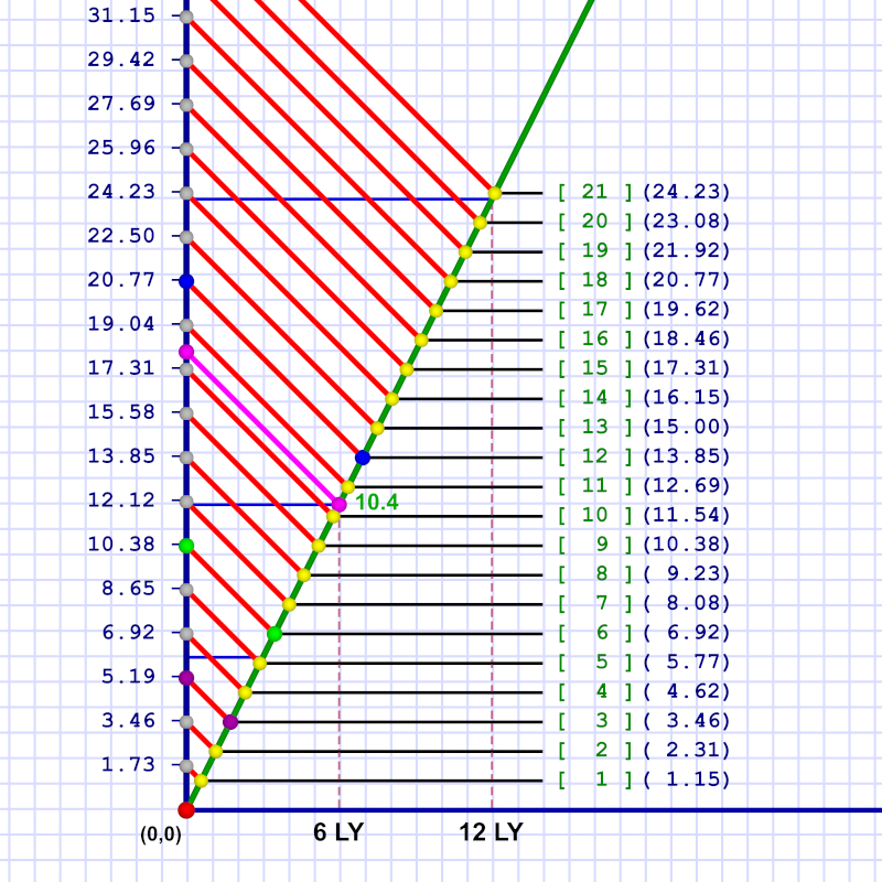 For instance (see purple dots), if either sends a message 6 years prior to meeting, the other receives it 3.46 years prior to that meeting. (I won't do the diagrams for Em's frame of reference. You can assume they are mirrors of these or get out some graph paper and draw some lines!)
