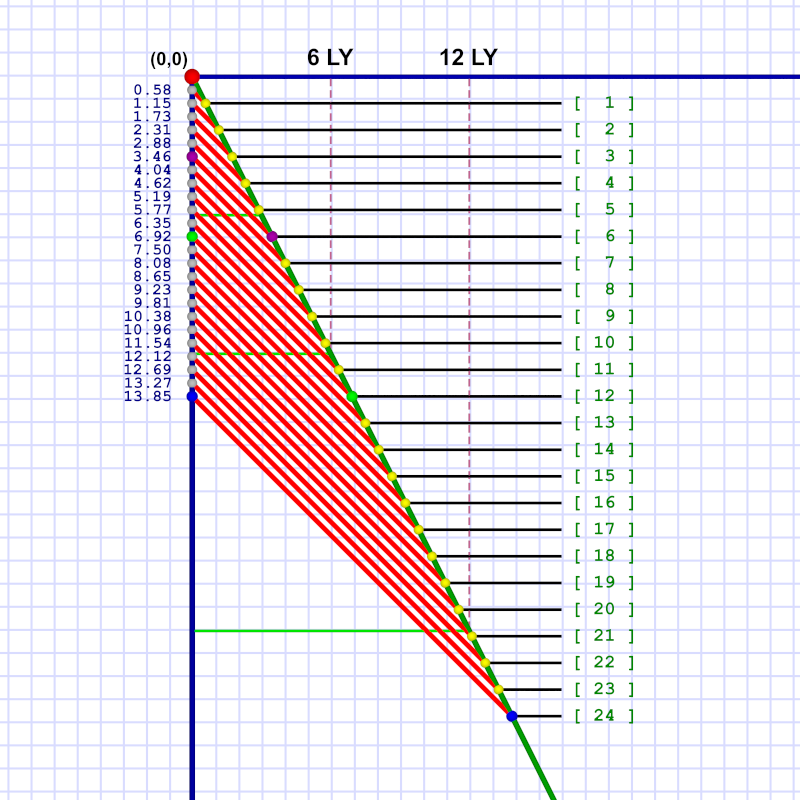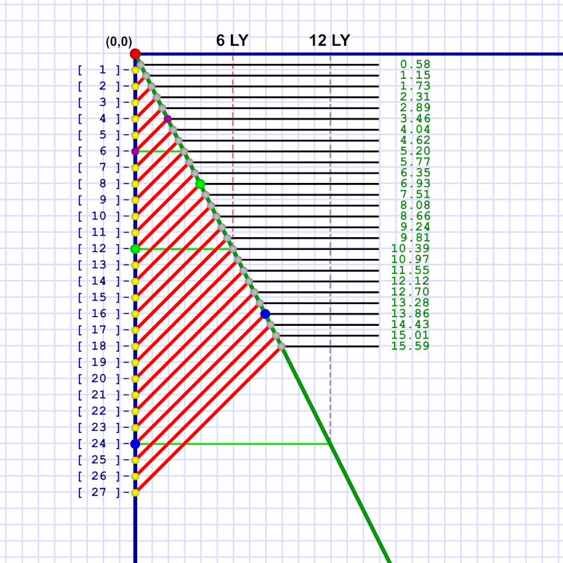 Let's consider just one instance. Remember how Al sends Em a message at his year 6 (and she receives it in her year 10.4). That one is shown in diagram 3 with green dots.