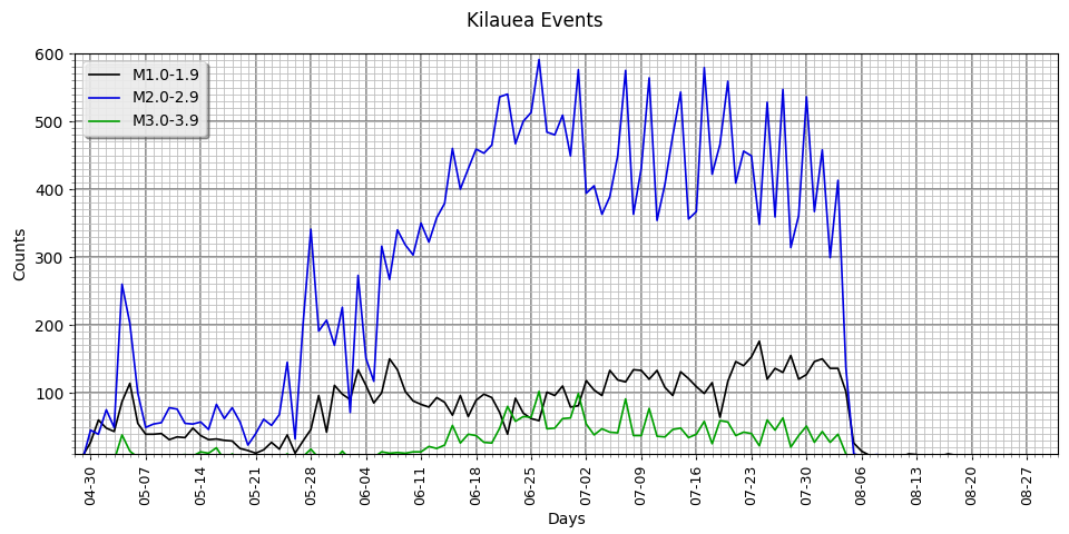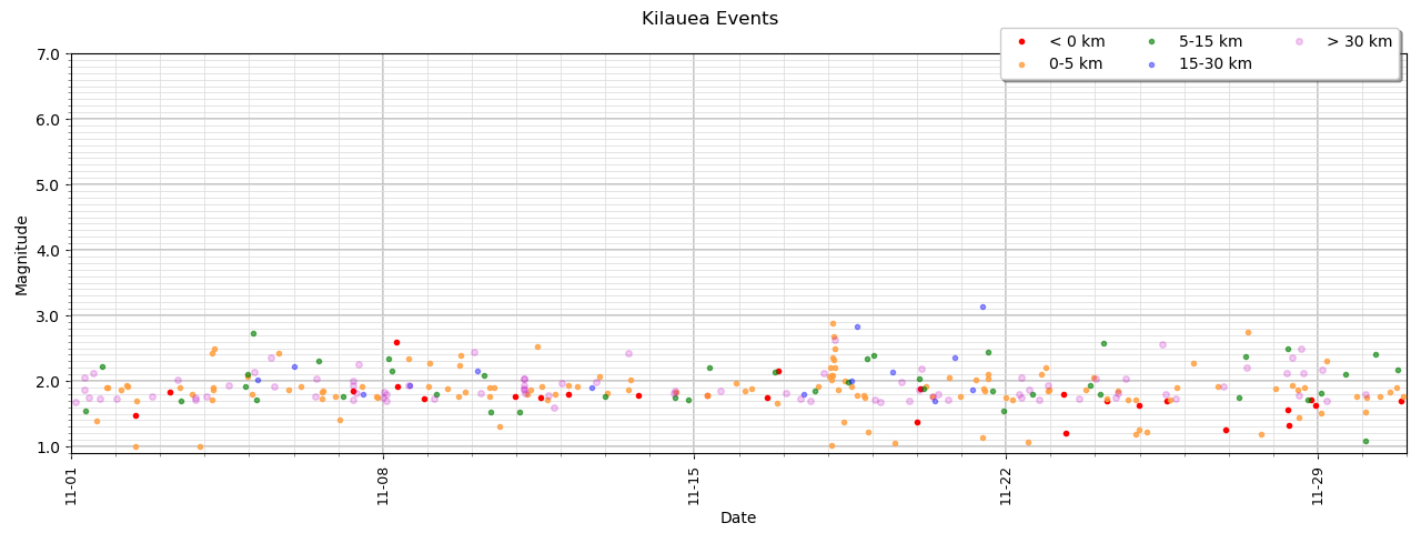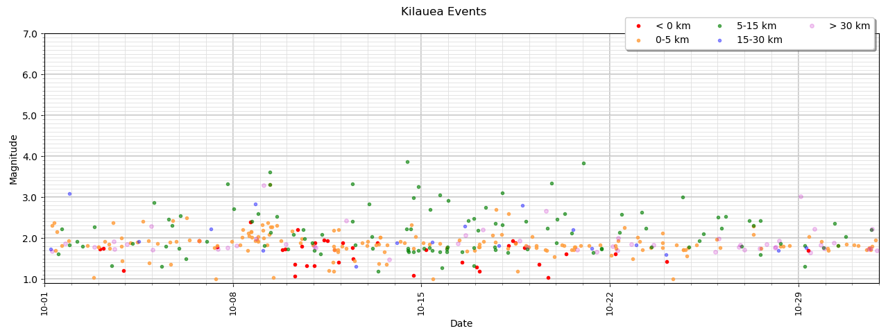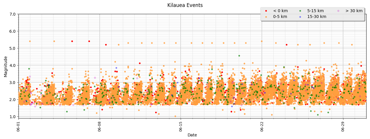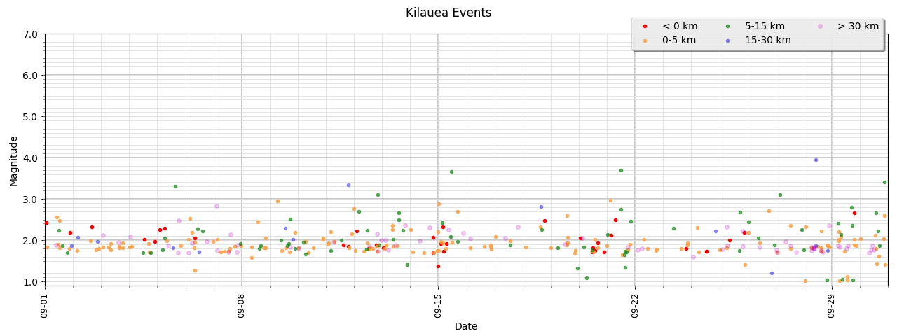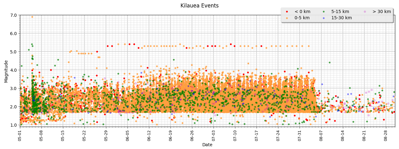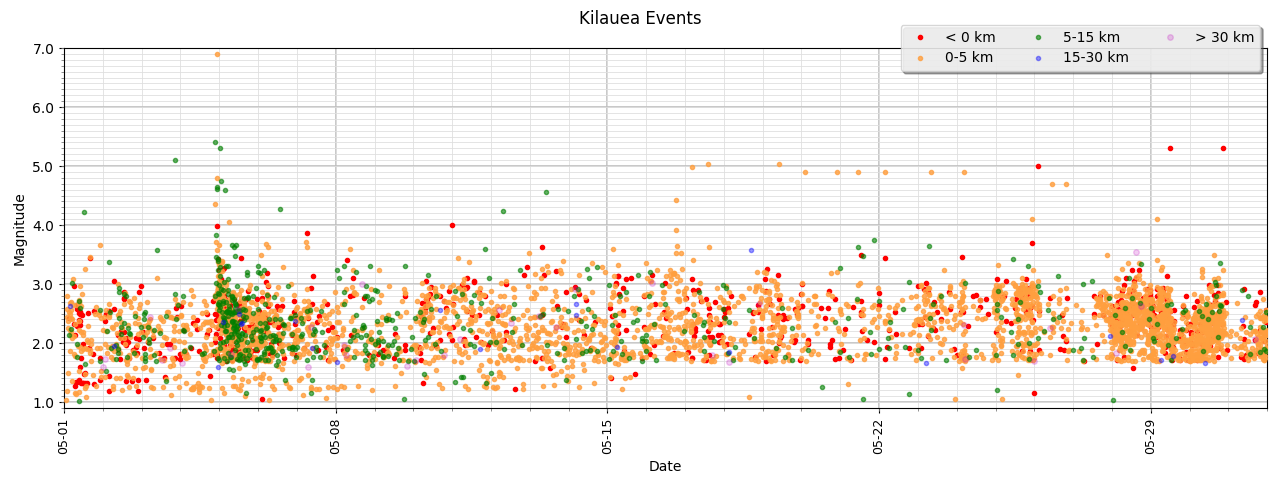 Events less than M3.0 are blue; M3.0 to M3.9 are green; M4.0 to M4.9 are orange; M5.0 to M5.9 are red.
